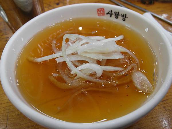 這個是沾肉用的沾醬,裡面放滿洋蔥,這個醬很好吃,熱熱的烤肉放進去之後馬上就可以入口,而且醬汁味道甜甜、鹹鹹的,很合我的口味XD!