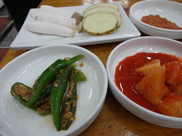 第一天晚餐的各種小菜,左邊綠色的是辣椒,右邊是醃蘿蔔。