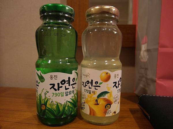 左邊的是蘆薈汁,右邊是水梨汁,還有一瓶沒拍到的是番茄汁。據喝番茄汁的人說明,番茄汁沒有番茄味道,很好喝,而喝這兩瓶的我們...蘆薈汁沒什麼特點,跟台灣能買到的差不多口味,水梨汁倒是一定要充分搖晃喝下去才好喝,沒搖過直接喝的話,會難以下嚥。