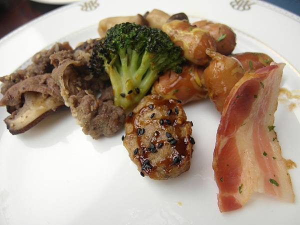 從左到右分別是牛肉絲炒香菇、牛肉丸、培根。後面被遮住的是小香腸。