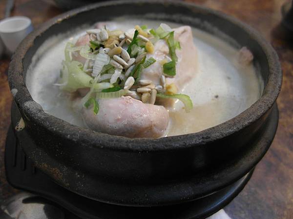 這次的中餐是韓國最有名的美食之一,人參雞。是用童子雞下去燉煮的,雞的裡面放滿糯米,還有栗子等等配料,最後再放一根人參下去。